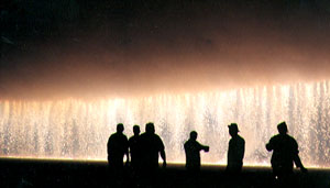| The waterfall in the image at left is best made with a wire suspended between 2 poles approximately 20 feet high. Each thin paper tube, loaded with waterfall composition, is attached to the wire with its "starter end" pointing down. The tubes, separated by about 1 foot, are all ignited at once by a length of quickmatch. The bright white sparks float all the way to the ground; the traditional "waterfall" effect. |
